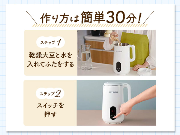 約100℃!パワフルなヒーターにより、硬い乾燥大豆をあっという間に柔らかくします。ソイリッチの完全豆乳はすりつぶす前に高温で一気に煮るから青臭さも残りづらく、優しく甘~い香り!