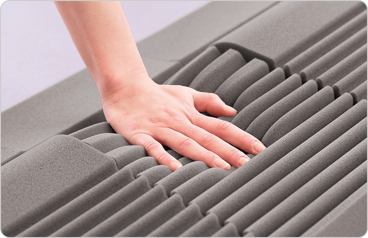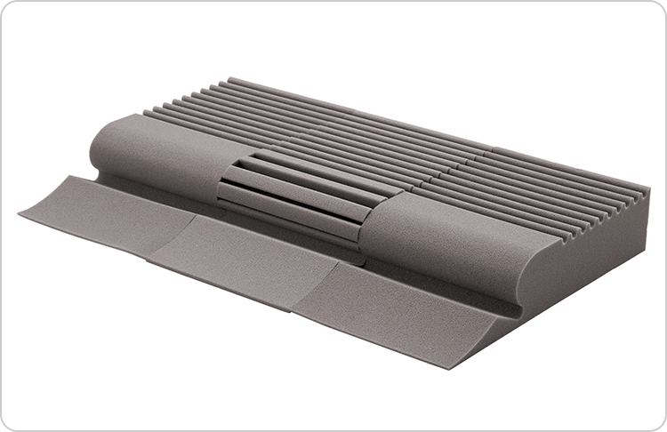 仰向きで寝る時と、横向きで寝る時では、適切な枕の高さが異なります。そこで、中央は仰向き用、左右両サイドは横向き用と3ゾーン構造を採用。中央はほどよく沈み、両サイドはより沈み込みにくいようスリットを配置。