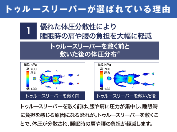 トゥルースリーパー使用前は、肩や腰などに圧力が集中し、違和感の原因になる恐れも。トゥルースリーパー使用時は、カラダにかかる圧力を分散して、睡眠時の肩や腰への負担を大幅に軽減することが確認されました。体全体をやさしく包み込んで、無理のない寝姿勢をサポート。朝まで快適にお休みいただけます。