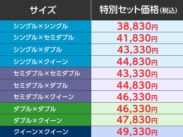 シングル・セミダブル・ダブル・クイーンの4サイズをご用意。お使いの敷き寝具の横幅に合わせてお選びください(メジャーで採寸してください。)