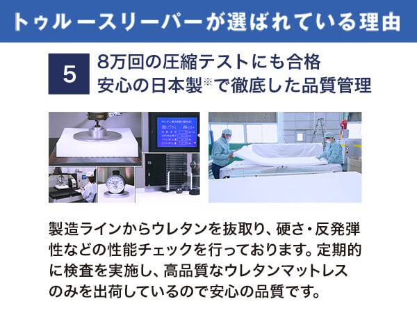 毎日使う寝具はやっぱり安心して使いたい。トゥルースリーパーのマットレスは国内で徹底した品質管理のもと製造しております。8万回の圧縮テストにも合格。
