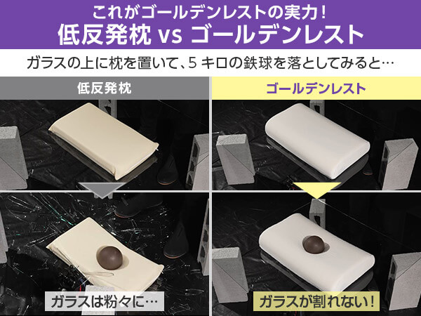 - 自社実験 ガラス(3mm)の上に置いた低反発枕とゴールデンレストそれぞれに鉄球(5kg)を落とす