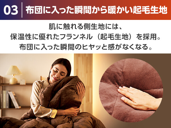 フランネル(起毛生地)を採用。布団に入った瞬間のヒヤッと感がなくなる。
