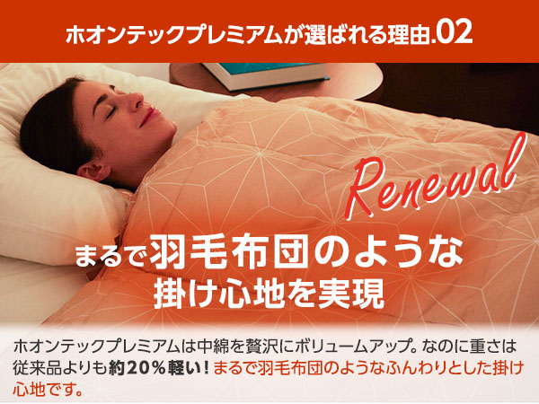 ホオンテックプレミアムは中綿を贅沢にボリュームアップ。なのに重さは従来品よりも約20%も軽い※!
