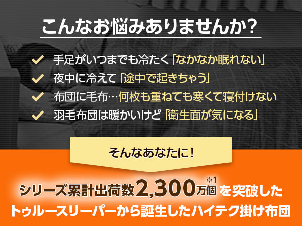 人は一度眠りにつくと体温を奪われやすくなっています。心地いい眠りに大切なのは睡眠中に熱が奪われない、保温性の高い掛け布団を選ぶことなんです。