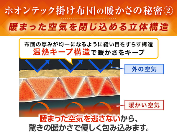 ホオンテックは中綿が特徴的で体温で温められた空気を上手にキープ出来て、さらに立体構造なので暖かさが逃げにくい。しかも、体にフィットしてくれるので、冷気が入りづらくなっています。一度暖まると暖かさが持続しやすくなっているため、掛け布団に悩んでる方にホオンテックはオススメなんです。