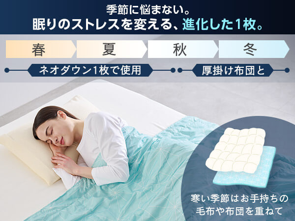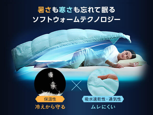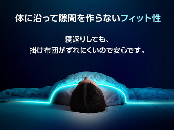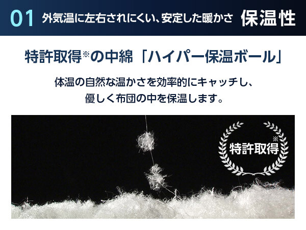 高級羽毛をヒントに開発された特殊な中綿が、体温の自然な温かさを効率的にキャッチし、優しく布団の中を保温します。