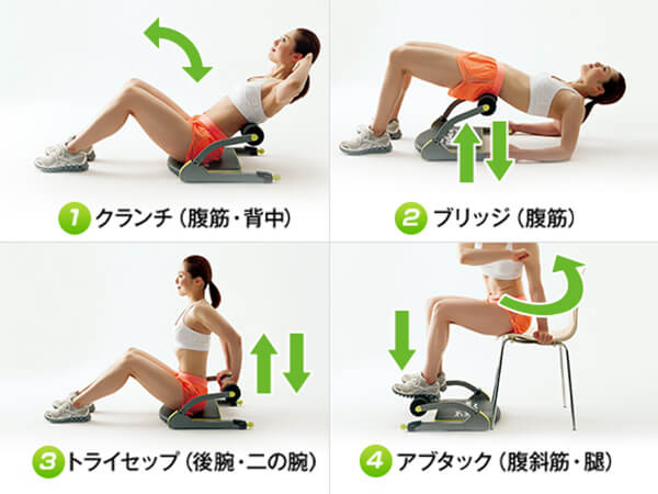 ただ腹筋だけでなく、背中から鍛える「ブリッジ」やイスに座って有酸素運動など全身運動がこれ1台で可能。