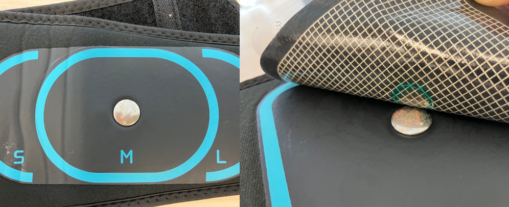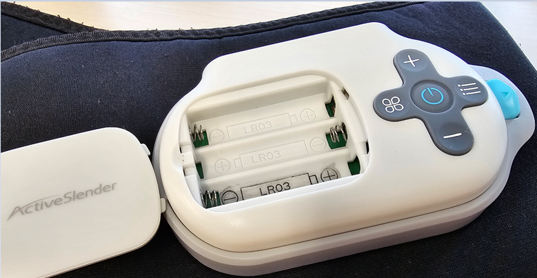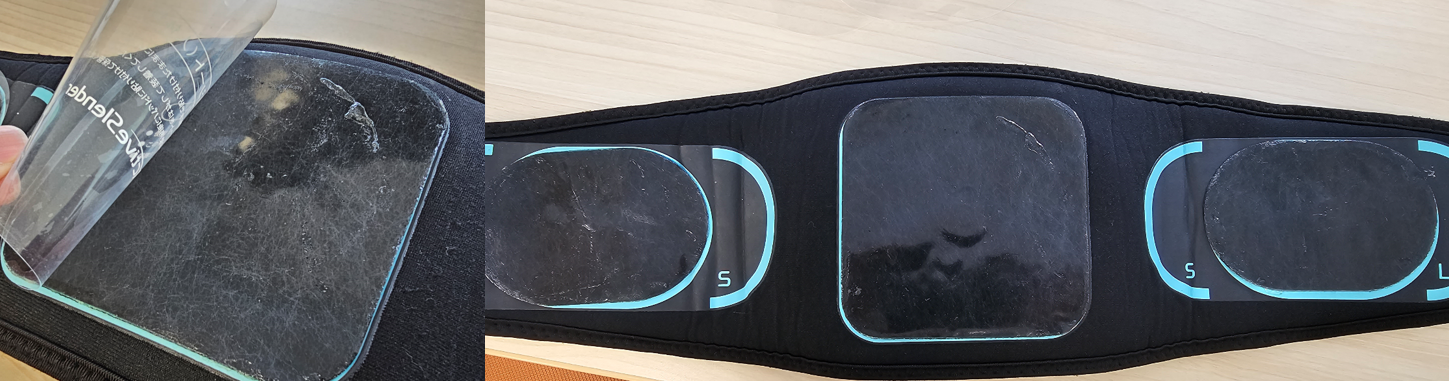 乾電池を入れ、パッドセットし、コントローラーをしっかりとはめ込み、ベルトをお腹に巻きます。