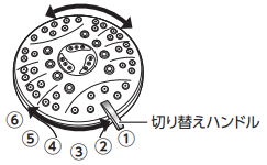 【モードの切り替え方法】 切り替えハンドルを回転させ、お好みのモード①~⑤の位置に合わせます。 正しい位置に切り替えるとカチッと音が鳴ります。