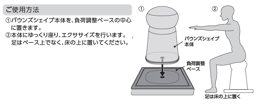 負荷調整ベースの上にバウンズシェイプ本体を置いて運動することで、膝の屈曲を浅くし、負荷を軽減することができます。