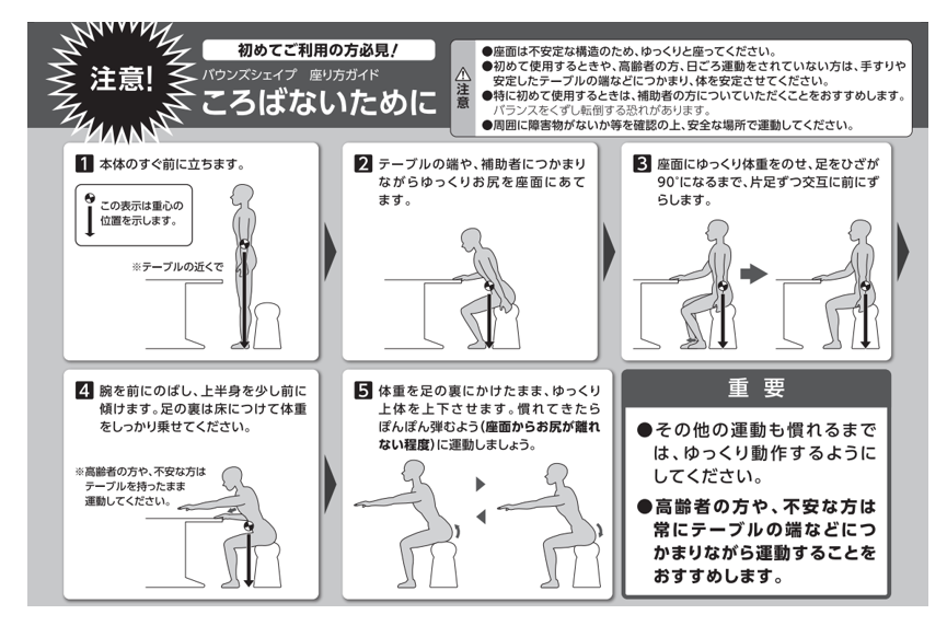 座面はバランスボールのように不安定な構造のため、ゆっくりと座ってください。