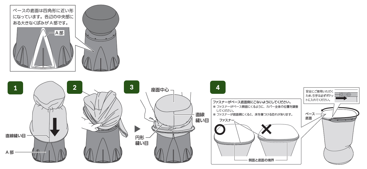 ❷カバーの中心と座面の中心が合うように調整しながらかぶせてください。