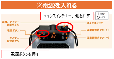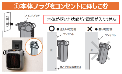 コンセントに装着し、電源を入れて温度設定をして使用します。