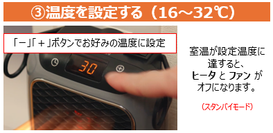 ・室温が設定温度に達すると、ヒータとファンが止まり、設定温度のみ表示される「スタンバイモード」になります。