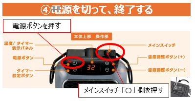 ・メインスイッチをオフにしない場合、前回の温度設定が保持されます。