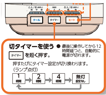 ヒート機能・クール機能どちらも電源が自動でオフになるように「1・2・4時間」の3種類から設定することができます。