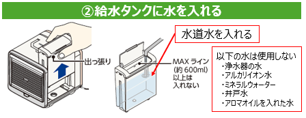 涼しい風が出なくなったら、給水タンクに水を入れてください。