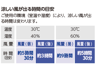 室温や湿度などの条件によって、涼しい風が出る時間は変わります。