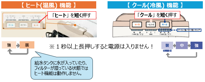 「ヒート」機能の場合、給水タンクに水が入っていたり、フィルターが湿っている状態だと、安全のため動作しません。