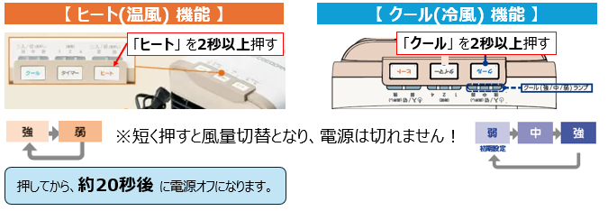 ご使用の「ヒート」または「クール」ボタンを短く押すと、風量の切り替えとなり電源オフになりません。