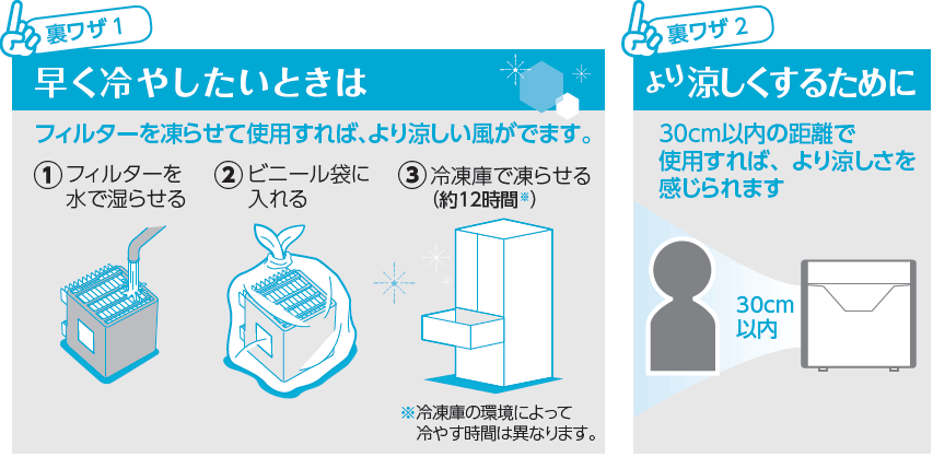 ③フィルターを凍らせて使用すれば、より涼しい風が出ます。