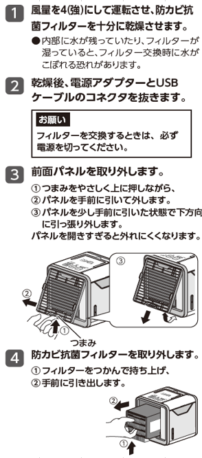 以下の手順に従って防カビ抗菌フィルターを取り外してください。