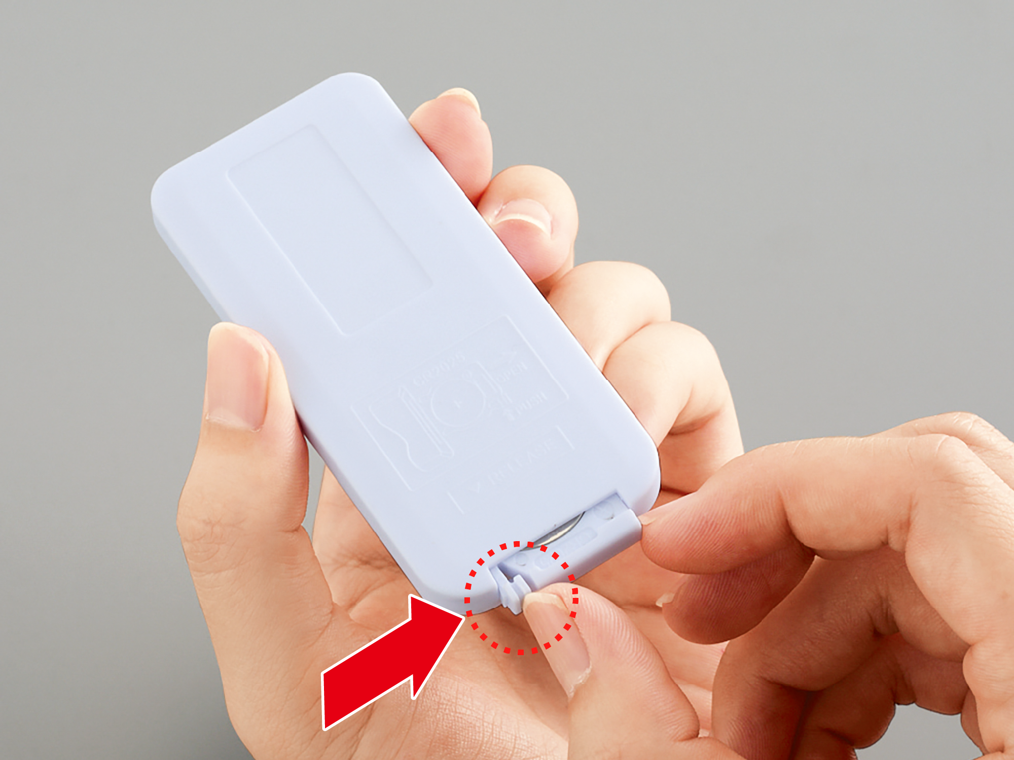 ①リモコンを裏返し、電池ホルダーのつめを内側(赤い矢印の向き)に押しながら引き出します。