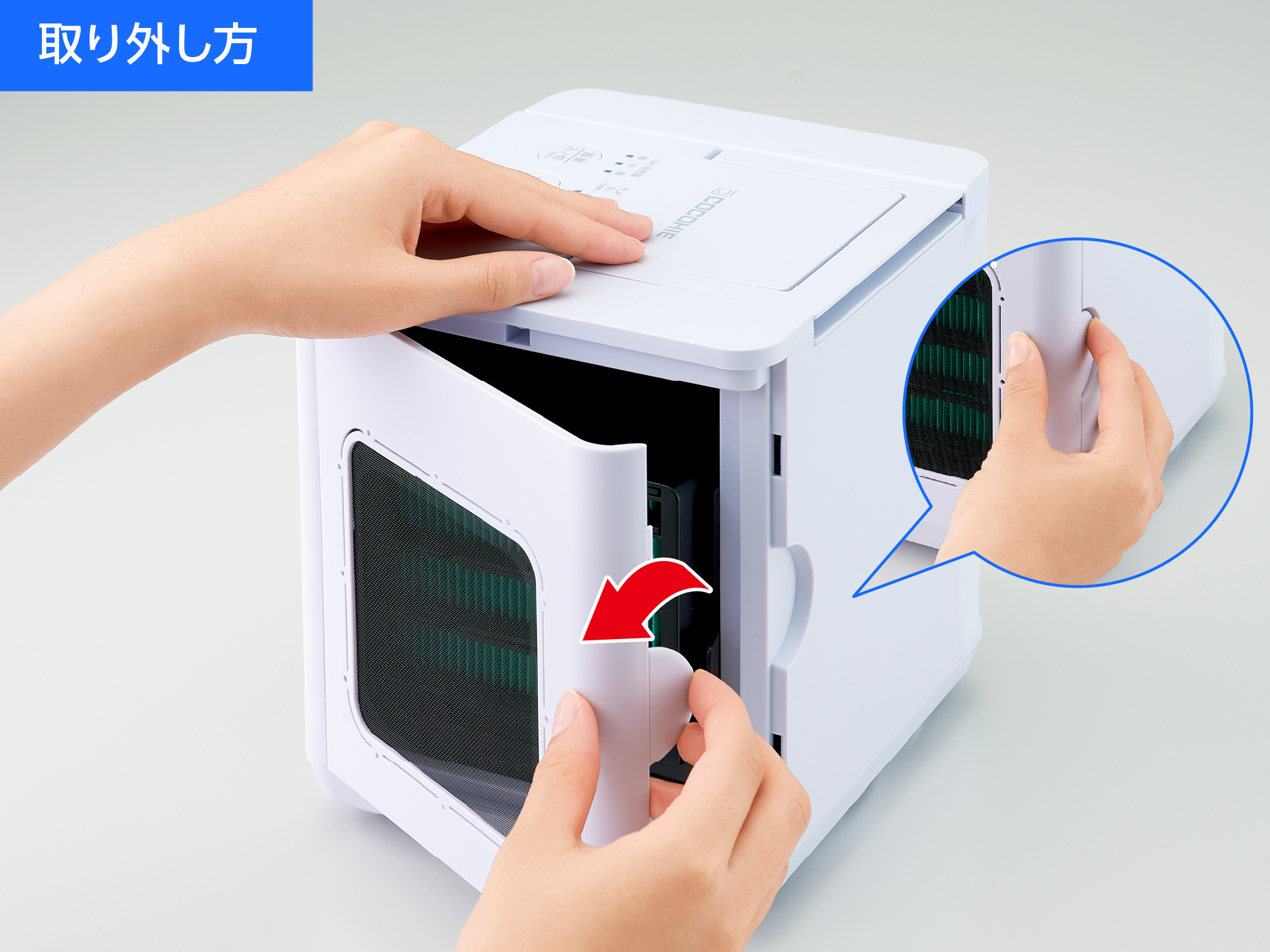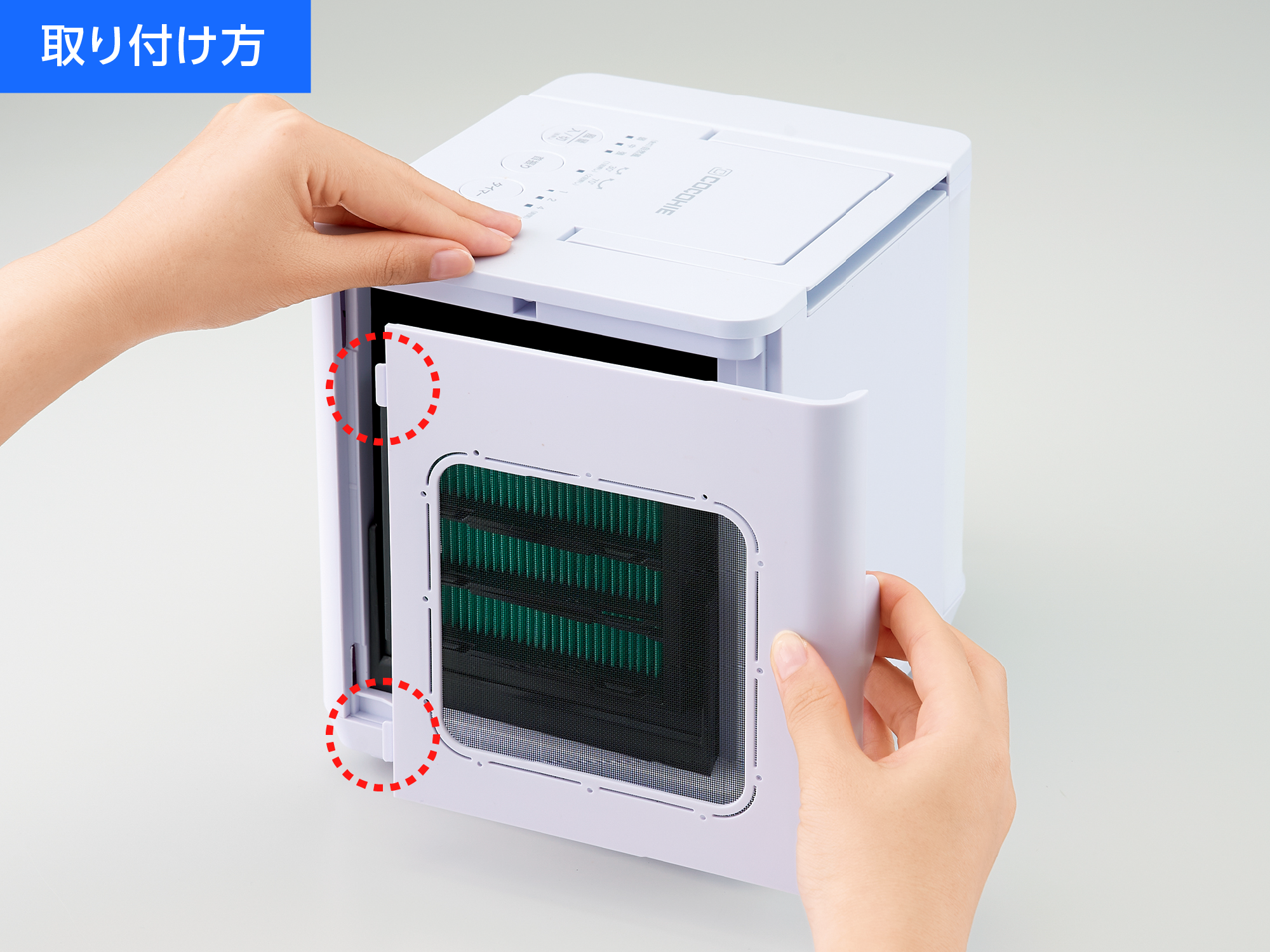 ツメ部分を本体側面の開口部に差し込み、カチッと音がするまで閉じます。