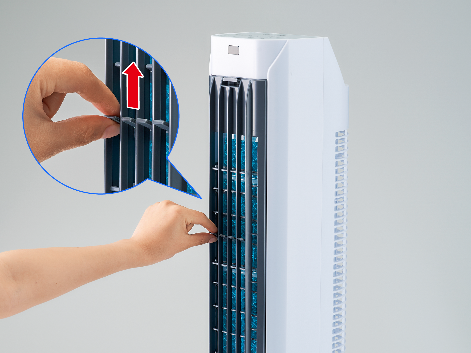 本体正面フロントパネル(風やミストが出てくる部分)の中央付近にある風向き調整用のレバーを動かすことで、上に風向き変更が可能です。