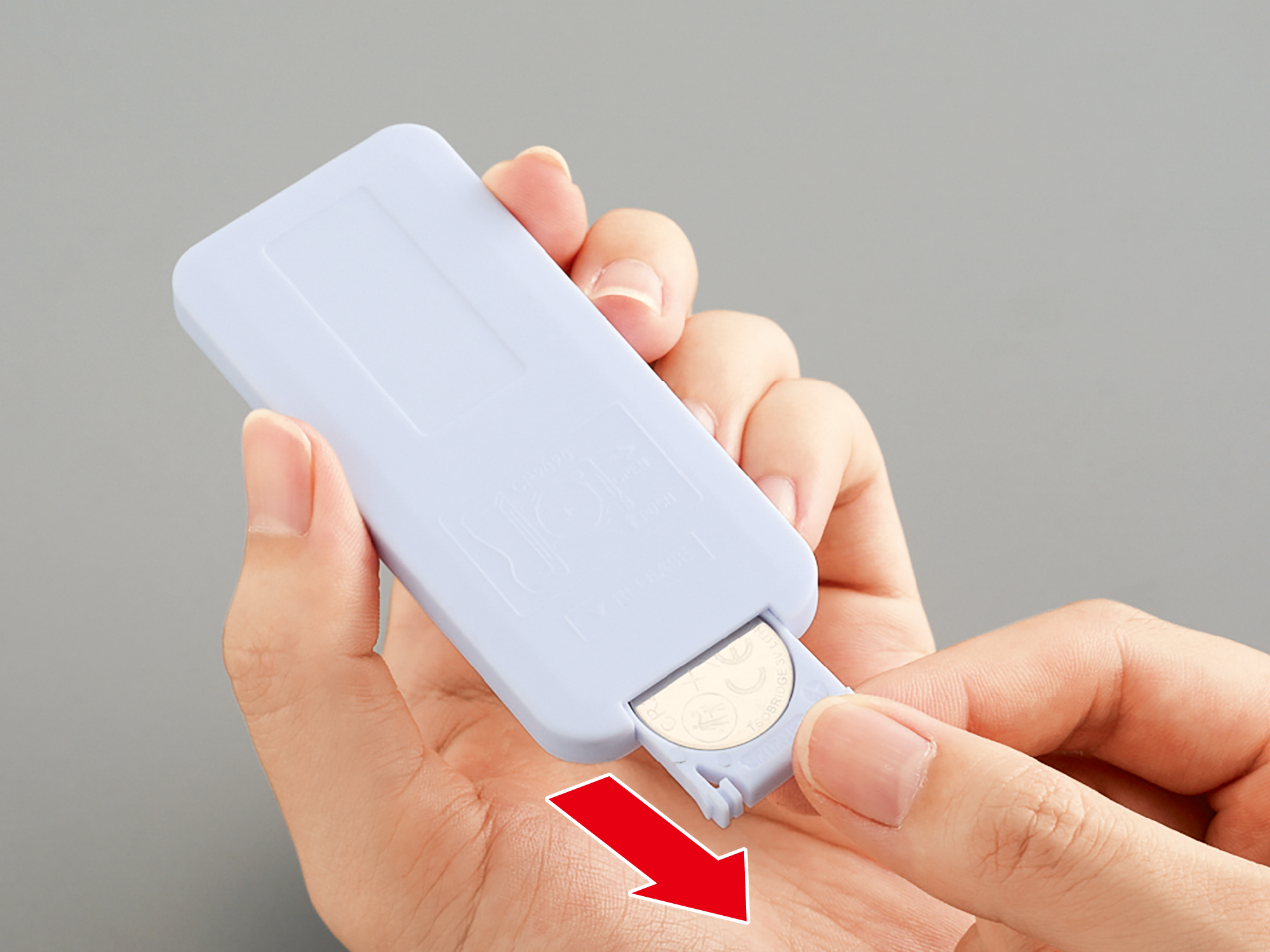 ①リモコンを裏返し、電池ホルダーのつめを内側(赤い矢印の向き)に押しながら引き出します。