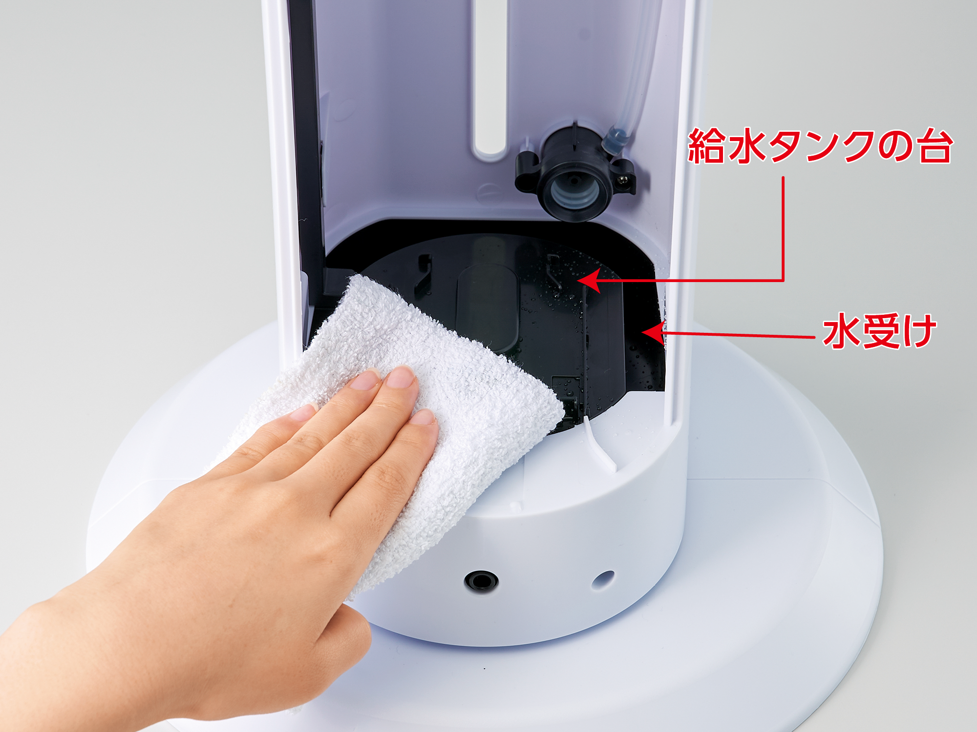 給水タンクの台の水は乾いた布で拭き取ってください。