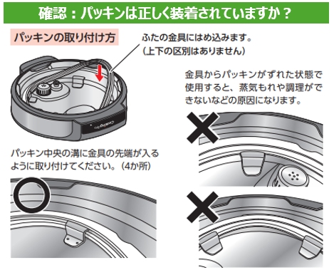 ●ふたのパッキンやなべの上端に、食材などの異物が付着していたり、変形や破損等はありませんか?