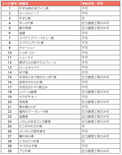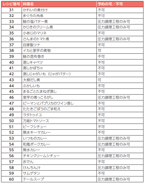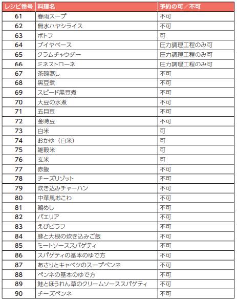 予約調理可能なメニューは、自動調理に登録されているレシピと、手動調理の「炊飯」 となります。