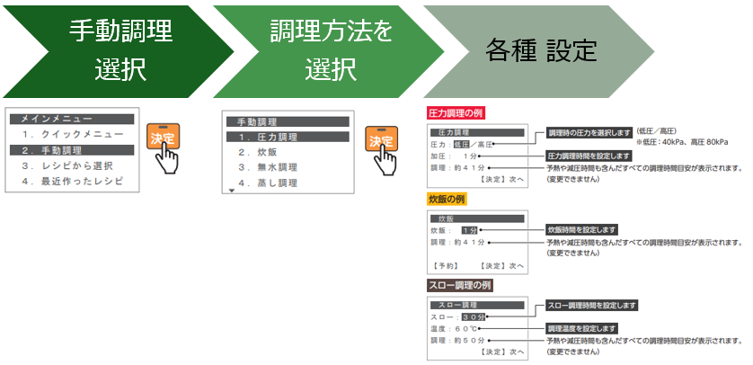 手動調理では、お好みに合わせて調理方法、調理温度、調理時間を手動で設定して調理することができます。