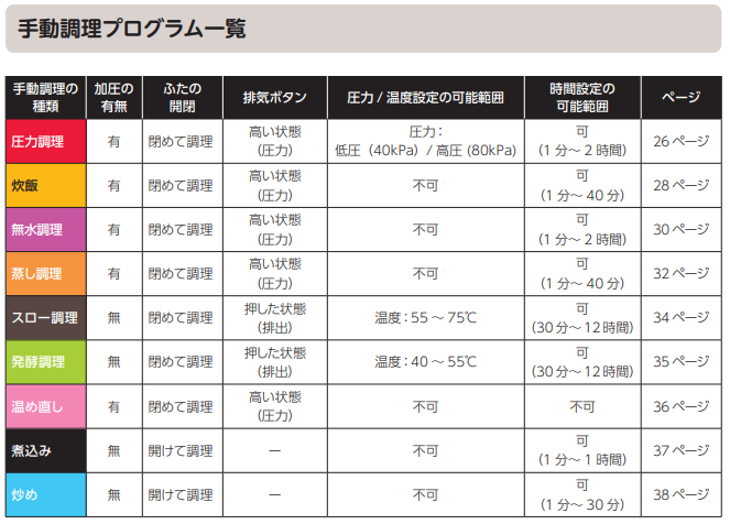 (圧力調理・炊飯・無水調理・蒸し調理・スロー調理・発酵調理・温め直し・煮込み・炒め)