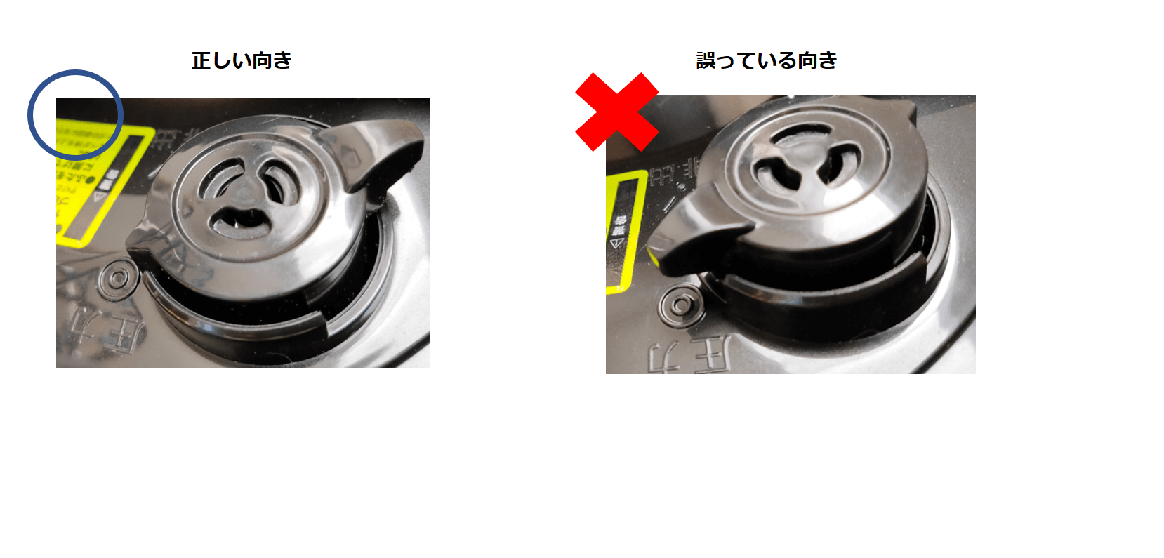 下記の様に向きが誤っている場合は、正しい向きに取り付け直して下さい。