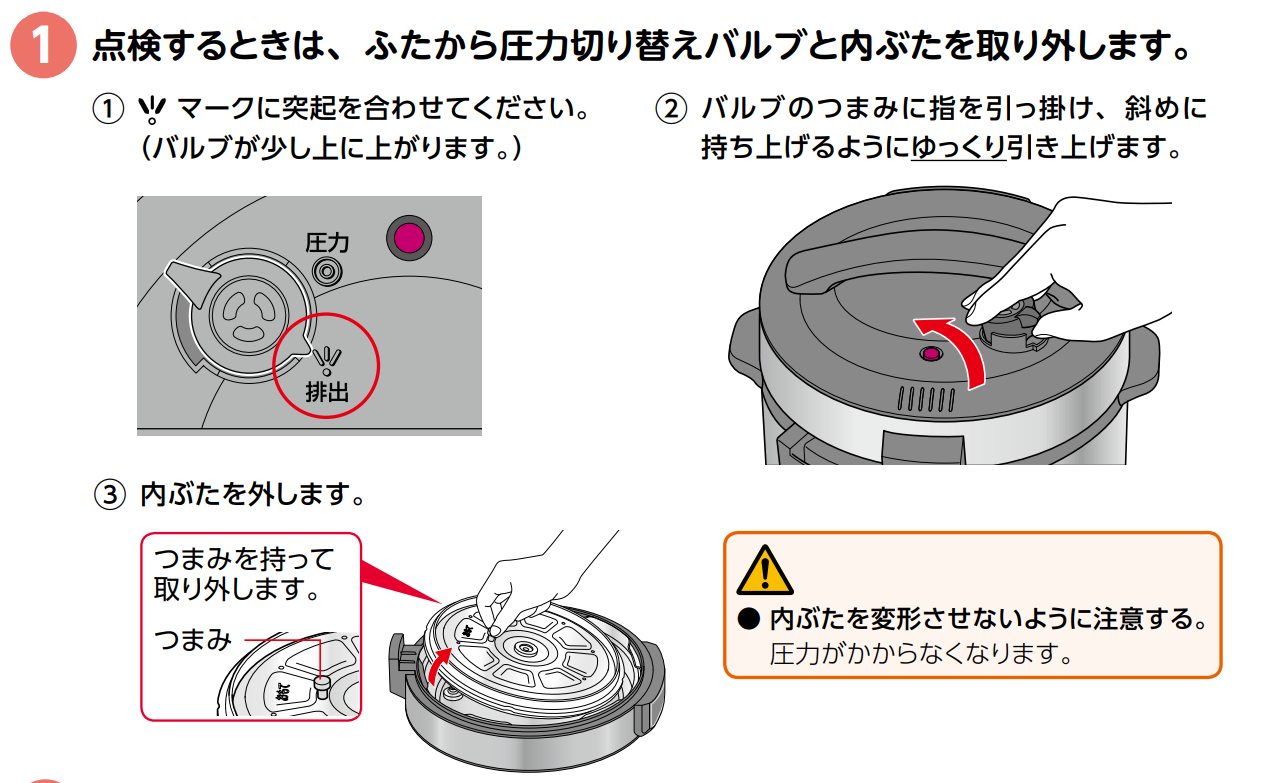 お手入れが終わったら元に戻し、再度調理を行って圧力表示ピンが下がるか確認してください。