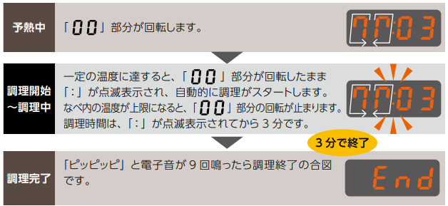 一定の温度に達すると、「00」部分が回転したまま「:」が点滅表示され、自動的に調理がスタートします。