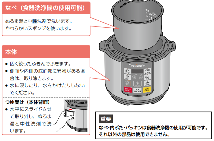 なべと本体部分のお手入れ方法は、以下となります。