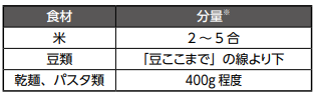 ・圧力調理で膨張する食材は、膨張したときにMAX線を超えないようにするため、以下の分量までにしてください。