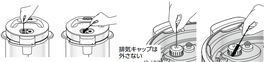 圧力バルブを取り外し、穴に付着している異物をお手入れ用ピンで取り除きます。(ふたの表と裏の両方)