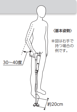 ハンドルに手を置いた時、肘の角度が30~40度になる位置が最適な杖の高さとなります。
