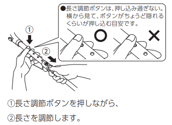 ①長さ調節ボタンを押しながら、