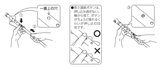 ③長さ調節ボタンが完全に穴から出ていることを確認します。