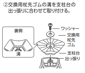 ②交換用杖先ゴムの上下の向きを確認し、ワッシャーとネジでしっかり固定します。