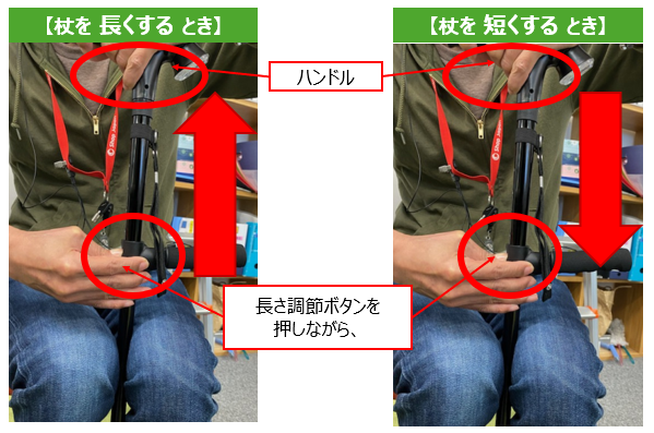 片方の指で「長さ調節ボタン」を押しながら、もう片方の手でハンドルを下から上へ、ゆっくり引っ張り上げてください。