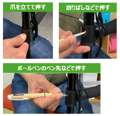 ②椅子に腰かけた状態で 杖を床に立たせ、両足で挟んで固定してください。