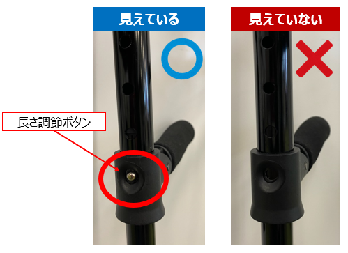 ①5段階ある長さ調節穴から、丸い銀色の「長さ調節ボタン」が見えていることを確認してください。
