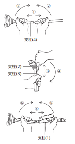 ③支柱のつなぎ目を、ゆっくり引き抜き、指を挟めないように注意しながら、杖先から順番に折りたたみます。